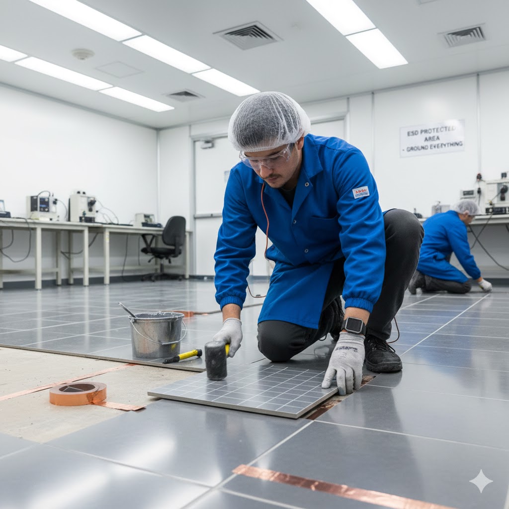 Electrostatic Discharge (ESD) flooring protects electronics from damage caused by static electricity, which accumulates as people walk.